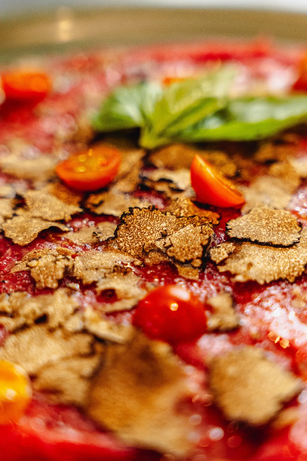 Tomate, mozzarella, Bresaola, roquette, huile de truffe et mozzarella di Bufala AOP